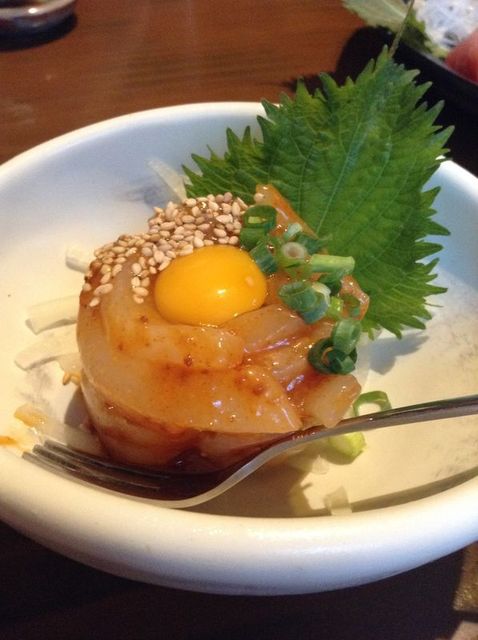 こちらのイチオシメニューが「セーイカのコク旨 自家製ラー油たれユッケ」であり、太めにカットされたイカとタレが見事にマッチ。