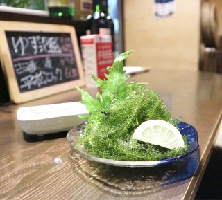 店長さん?もフレンドリーな方で、ひとしきり沖縄談義も。メニューは、もずく酢や海ぶどう、チャンプルーといった定番沖縄料理を筆頭に、店長目利きの刺身、天ぷらなど幅広い取り揃え。