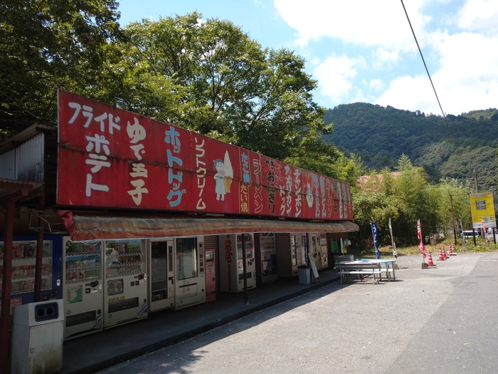 自然いっぱいな道路沿いの商店にある24時間利用できるうどん、ラーメン自販機です。