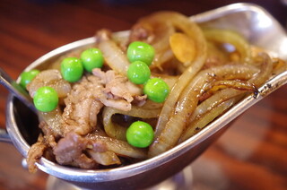 そして昔ながらのルー入れにグリンピースが散りばめられたハヤシが盛り盛りでご飯も別皿に大盛りで到着(^_^)v早速1回で豪快に山盛りご飯の上からルーを流し込む!!!ビックサンダーマウンテ~~~~~~~ン!!!!デミグラスソースは、やや薄めの少な目で玉ねぎ多めの牛肉そこそこの量でこってりというより、あっさり系のサラサラタイプで丁度いい優しい味わい。濃いめをと程よい苦みを想像していただけにビックリ!!
