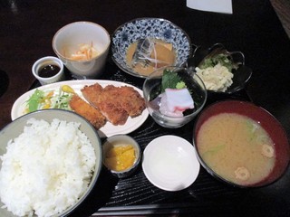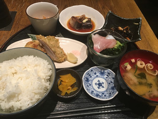 日替わりとおばんざいのメニューの説明があり、なんとなくおばんざいにします。正直おかずの数に驚いた。これで1,000円を切るというのは、この辺ではまずないのではないかと思う。チキンカツ、ラタトゥーユ、冬瓜、刺身、そしてホッケ。これだけおかずが多いと、どれから食べようか迷うくらい。チキンかつ、中は柔らかくておいしい。衣はちょっと固いかな。ラタトゥーユは、トマトの味がしっかりしていておいしいです。冬瓜は柔らかく煮込まれていて、ホッケは皮までしっかり食べられます。塩も程よく。