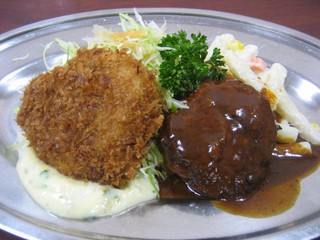 銀の皿で出てくる懐かしいビジュアルハンバーグ。ハート型の目玉焼きが可愛くて素敵なんですが、お客は大半がおっさんです(笑)。厚みがすごいハンバーグにとろっとチーズがのってます。じわっと断面から肉汁がとめどなく溢れてくるパテ。デミグラスソースも深い味わいでチーズともあいました。美味です。