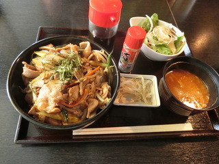 チキンステーキ、トンテキ、チキンハンバーグ、ハッシュドビーフがランチにラインナップ。チキンステーキはセロリソースと少し工夫されています。ごはんもお代わり自由。スープ。サラダが付いています。