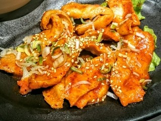 豚トロ:ほどほどに韓国味のタレが絡まった豚トロは脂身があるのにしつこくなく、タレの甘辛味のおかげでご飯を口に運ぶ箸が進みます。