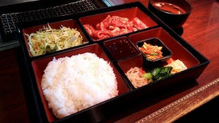 焼肉ランチ(980円)をいただきました。重箱に、お肉、サラダ、キムチ、ナムル3種、ご飯、タレが入ってます。ワカメスープだけ、お椀で出てきました。テーブルに埋め込み式の無煙ロースターで丁寧に焼いていただきます。お肉は、フツーに美味しかったです。サラダは、キャベツ・レタス・人参。