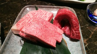 お肉は1種類か2種類まで次の中から選べます。A5カルビ、A5中落ちカルビ、A5ロース、タン元。今回は、A5カルビとロースをチョイス♬ はじめに、サラダとナムル、煮込、カクテキが出てきます。続いて、お肉と白米、スープ。お肉はサシが入って美味しそう♬ 石の上で焼いて頂きます!口で裂ける軟らかさと肉の甘みが感じられる上質なお肉に満足♬