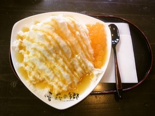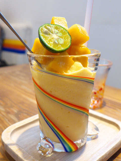 和風カフェな店構え。店内も角ばった濃いめの木のテーブルや椅子を配してやっぱり和カフェ風です。かき氷のメニューはたくさんあります。デフォルトの雪花冰(シェーホァピン)以外に苺やチョコや抹茶やマンゴーや黒糖・・・目移りしちゃいますね~オーダーは情熱果実¥600。那覇店のオリジナルみたいですね、人気No.1で、パッションフルーツを使っているとのこと。絶対美味しいハズ♪