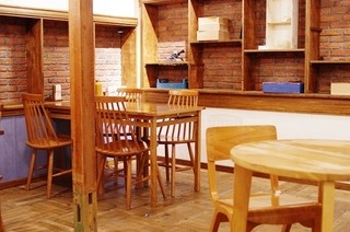 地下にイートインスペースがあります。木のぬくもりを感じる、シンプルな内装。