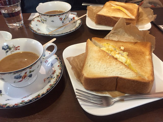 ここのホットコーヒーが飲みたくて、二日連続だけど行ってしまいました。で、行ったらサンドイッチが食べたくなり、セットのコーヒーを。マンデリンでした。おいしかった!で、で、更にフレンチトーストも食べたくなり、レビューで「量、多め」と書いてあったのも思いだしたんだけど、食べました。満腹。普通はサンドイッチかフレンチトーストのどちらかで十分だと思いますが、両方とも手が込んでて、おいしかったです。