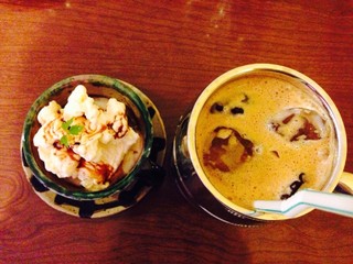 こちらは全国にいくつか店舗を展開している台湾発の新スイーツ「雪花冰」のお店ですが、冬季限定で中華粥もやっています。台湾珈琲とセットで900円。焼き石の入ったお粥は、ジュージュー、ボコボコと音を立てながら熱々の状態で出てきます。冬季限定とはいってもここは沖縄なので、一汗かきながらいただくことになります。そのまま食べると相当薄味ですが、小さいお椀に少しずつ移し替えながらザーサイなど3種類の薬味をいろいろ組み合わせて、味変させることができます。