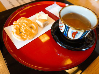 畳の広間になっていて掘りごたつ風のの大きいテーブルに相席で案内されます。お盆にさんぴん茶、沖縄のお菓子4種が出てきてしばしくつろぎます。途中で昔は女性が入れなかったそうなので男装の女性店員さんが建物やお菓子の説明をしてくれますので勉強になりますね。