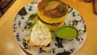 いち押しメニューはパンケーキ!ベーシックなものから変わり種までありますが、中でも注目は「七穀バターと抹茶カスタードソースのパンケーキ」。大豆や玄米を使用した珍しいバターだそうです。抹茶のソースもお好みの分量でどうぞ。