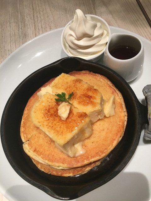 パンケーキは可愛らしい鉄板で提供。純生クリームやメイプルソースはお好みでかけることができます。