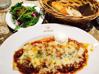パンケーキだけでなく、ランチ・ディナーと食事系のメニューも揃っています。こちらはピリ辛な「メキシカンエンチラーダグラタン」。ランチタイムであれば、食後のデザートとして210円でプチパンケーキが付けられますよ。