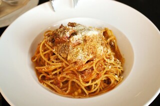 パスタは、牛豚肉の煮込みミートソースを。これはひき肉ではなくて、塊の牛と豚を柔らか~く煮込んだもの。フォークで崩れる柔らかさです。煮込まれた肉と野菜の旨味が、濃度が濃いめのソースとなってリングイネとよく絡みます。肉の塊を崩しながら、リングイネと一緒に食べるのがおススメだそうです。アルデンテのリングイネの噛み応え、肉とソース旨味が口の中で溢れました。