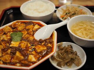 メインの麻婆豆腐に、惣菜、スープ、ザーサイ、ご飯がついた、ランチタイムにもぴったりのセットメニューです。