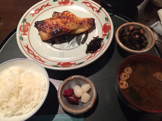 この日は定番メニューから銀むつの照り焼き。注文が入ってから焼き上げるのでしばし待ちます。銀むつはふっくらとした焼き上がり。照り焼きと魚の旨みがありご飯とよくあいます。お味噌汁は赤だしで若布がたっぷり。お漬物と温泉卵も定番です。ご飯はおかわり自由なのでお魚と楽しんだり、温泉卵をのせて食べます。柔らかめの炊き加減で、おいしいです。大根おろしもテーブルに1つ大きな茶碗でいただけます。