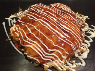 横浜駅東口のスカイビルの11F。エレベーターホールの近くにあります。特選ミックス焼きと豚ネギ焼きと広島焼きをいただきました。スタッフの方が目の前で焼いてくださるのでお任せできます。青のりや鰹節、ソース、マヨネーズのトッピングはお好みで自分たちでやります。ミックス焼きはふっくらダシがきいた美味しいお好み焼き。ネギ焼きはねぎたっぷりで文句なしの美味しさ。