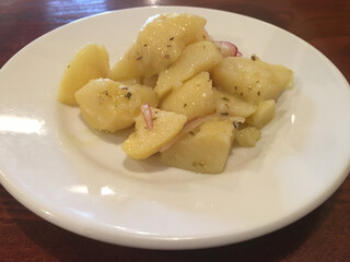 ランチで最初にサービスされるのは、「ポテトのサラダ ビネガーあえ」。ポテトと紫キャベツのサラダで、ビネガーが効いていて美味しいそう。味付けは繊細ながらバランスが良い美味しさとのこと。