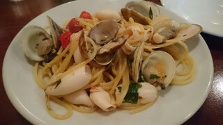 サラダはじゃがいものビネガーソース合え。ここのビネガーソースは酸っぱすぎず、じゃがいも、きゅうり、紫玉ねぎとあえてありなかなか。サラダを食べてしばし待つとアーリオエオーリオ到着。わー!あさり、はまぐりなどの貝類そしていかがふんだんに入っています。パスタは太目ながらも柔すぎず固すぎずほどよいゆで加減。ミニトマトと貝とパスタを混ぜ合わせて食べます。濃厚な味付けです。