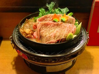 林檎、長芋、玉ねぎなどを使い、氷砂糖で優しい甘みをつけた割り下がとろけるお肉とよく合い、よりお肉の美味しさを引き立てとても美味しいです。また、国産黒毛和牛のサーロインは、脂の甘みが強く口の中でトロけます。なんとも幸せ~。