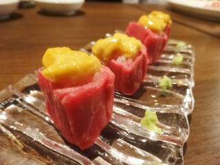 うしごろ名物とも言える雲丹寿司は雲丹と生肉のバランスが絶妙!するっと胃の中に収まるので是非オーダーを。