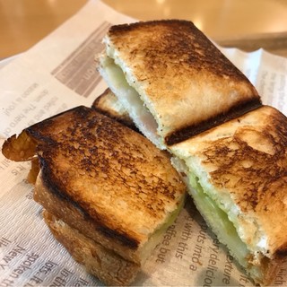 ホットサンドのアボカドとベーコン、アイスコーヒーを食した。