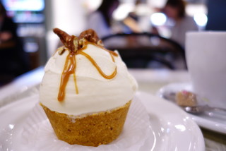 上に乗ってるのはクリームではなくムース状のチョコレート。この食感は好き嫌いが分かれそう。キャラメル感は少なく、チョコとバナナの風味に胡桃の食感がアクセントなケーキ。