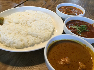 美味しいです!ひよこ豆ほくほく、トマトラッサムはトマトの形しっかり。野菜カレーは一つはスープ系、一つはサンボル系。スープ系はやや酸味あり、サンボル系はスパイシー。味わいは全く異なります。スープ系のほうに、お芋系が多かったかな? さつまいもの素揚げが添えてありました。ライス少な目にしていただいたんですが、このご飯がまた美味しい。