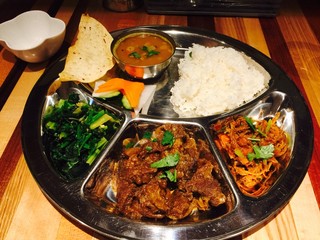狙い目は、月曜と火曜に数量限定で提供されるという「ダルバート」。かなりボリューミーであり、豆を主体としたカレーや副菜がセットになっています。