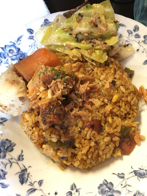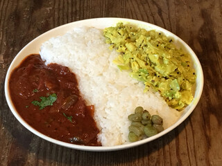 プレートにきれいに盛り付けられたカレー。緑色は惣菜かと思いきや、何と「キャベツのココナツカリー」なのです。クミンの香りと甘さが特長だそう。