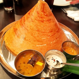 この円錐状の食べ物、ご存知ですか?カレー好きの食べログレビュアーなら見たことがありますよね。「ドーサ」という米粉のクレープであり、ナンと同じようにカレーを付けて頂きます。揚げパンの「バトラ」も選択肢の一つ。