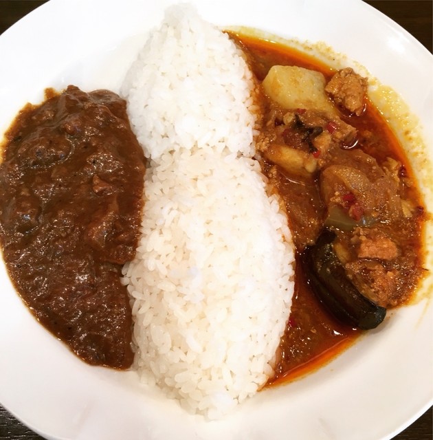 まるで防波堤のように真ん中に盛られているライスを崩して、2種類のルーをミックスしても美味しそうです。