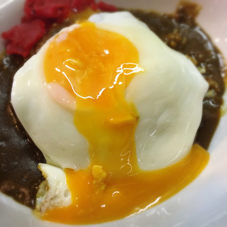 「ニューキャッスル」ではカレーを「辛来飯(カライライス)」と呼んでいます。乗っている目玉焼きは半熟で、少しつずつ黄身を壊しながら食べるのがおすすめだとか。