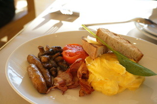 スクランブルエッグは舌触りが滑らかで薄い味付。最初はこの状態で卵の繊細な美味さを楽しむのが良さそうだ。ベーコンはカリカリでジューシー。やっぱ、朝のベーコンはこれじゃなくっちゃ。
