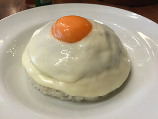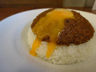 半円を綺麗に描いたライスの上にキーマカレー、さらにそれを覆い隠すようにモッツァレラチーズがたっぷり綺麗にかかっており、真ん中に卵の黄身がのっています。卵の黄身をツンっとすると、とろーり。キーマカレーはとっても、スパイシーで辛め、クセになる美味しさです。