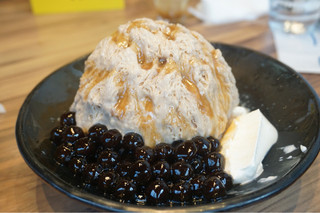 ミルクティーかき氷の上に、パンナコッタ、タピオカがのり、キャラメルシロップをかけて頂きます♡キャラメルシロップのおかげか、ちょっと香ばしくて、コーヒーっぽさもあるカキ氷でした。