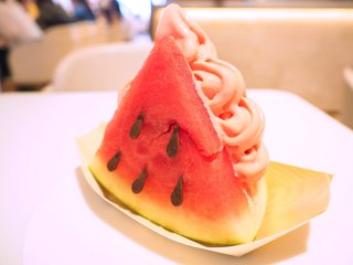 こちらの「ウォーターメロンソフトサーブ」は、スイカに太い切れ目を入れ、その間にスイカソフトサーブをサンドした、こちらもインスタ映えするメニュー。