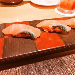 赤酢を使った甘めのシャリに、築地直送の魚介や沖縄の食材を合わせ、岩塩で味わう握りも入ったコース料理がおすすめです。