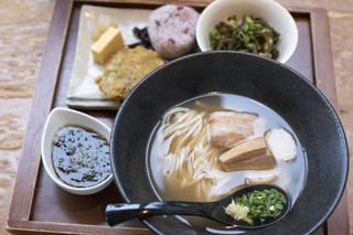 島豚とカツオをメインにしたダシに、トッピングが選べる沖縄そばは、紅芋ご飯、もずく酢なども一緒に食べられるセットがおすすめです。