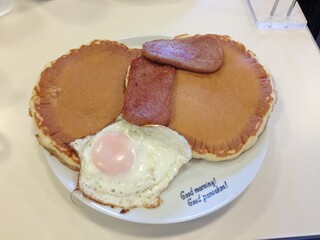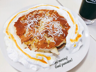 バナナを挟み、ナッツソースをかけたナッツナッツパンケーキがおすすめです。甘くない、ベーコンパンケーキなどもありますよ。