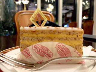 店内はいかにもヨーロッパという内装のオシャレで優雅な造り。平日夜だからなのか、お客はみんな男女のペアでした。デザートは別腹。ケーキは好きなものを選べたので、ハンガリーっぽいものを選択。クルミを使っているケーキが多かったような気がします。