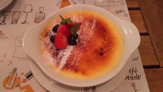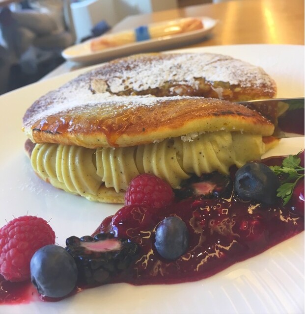 ブリュレ風パンケーキ。パンケーキはやや薄めで2枚。間にちょろっと見えるのがカスタードクリーム。キャラメリゼされた表面はパリパリ。苦味はそんなないニュートラルな味。ベリー達は甘酸っぱく、シャンティは軽い。さらっとイケるパンケーキですね。