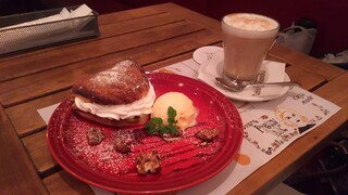 大変ムーディーなカフェ。印象としては、あまり目立たず、隠れ家的な感じが良いです。ガトーショコラは、いわゆる濃厚系ではなく、トップスのチョコレートケーキを濃縮したような感じでした。こちらも生クリームがたっぷりついているのが嬉しいです。