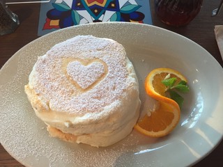 パンケーキは厚さ3センチはあろうかというものが2枚。メレンゲをしっかり泡立てるタイプのようにしゅっとするわけでもなくしっかりした歯ごたえのある面白い食感です。ボリュームがありましたが最後まで飽きずに食べられました。