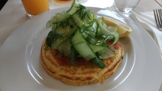果肉ゴロゴロなベリーソースがパンケーキの上に。付け合わせの小さな器に追ソースがたっぷり。甘さと酸味が同じくらい。くどい甘さではないです。パンケーキの表面はかりっとした感じ。ふっくら焼かれてます。パンケーキより、ホットケーキ寄りな重さがあります。