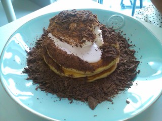 プレーンで登場。写真とっていたら、ホイップが!動いた!!でわ、チョコレートかけてもらいますよ!2杯くらいがよいみたい。2杯半かけてもらったよ。かけ放題です。ストップと言うまで削ったチョコレートをかけてくれるの。夢のような・・パンケーキです。