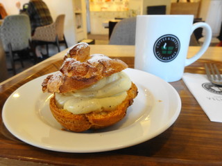 カリカリ香ばしいシュー生地の上部をカットしカスタードクリームを注入、生地のふたをしてありました。ふたを外し、そこにクリームを塗りつけてパクリッ!このカスタードがけっこうしっかり甘くて!カリカリで温かい生地と冷た~いクリームのハーモニー。