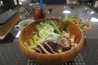 「ロコモコ」来ました~大きい器(◎0◎)大きい~思わず言葉が出ましたねぇ(笑 アボカドにサイコロ状とまと、レタスに水菜。メインのハンバーグ、フライドポテト中央に玉子がのっています。完熟のアボカドが美味しい。