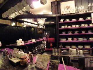 棚に並べられているだけでなく上からもティーカップがたくさん吊るされています。どんなカップでコーヒーを頂けるのか楽しみですね。